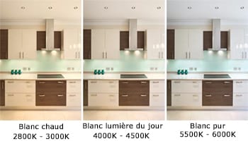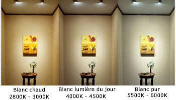 Plus techniquement: le blanc chaud équivaut à 2800/3000K, le blanc lumière du jour équivaut à 4000/4500K et le blanc pur équivaut à 5500/6000K.